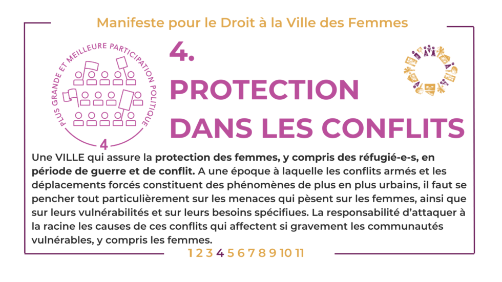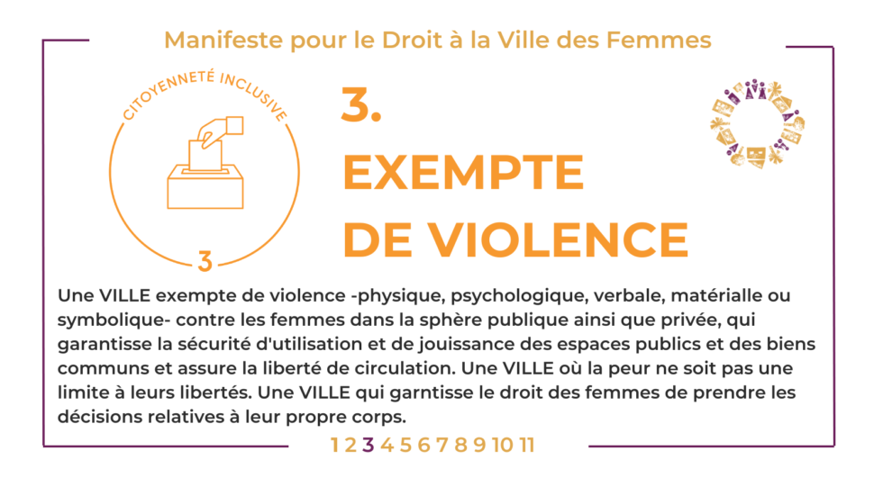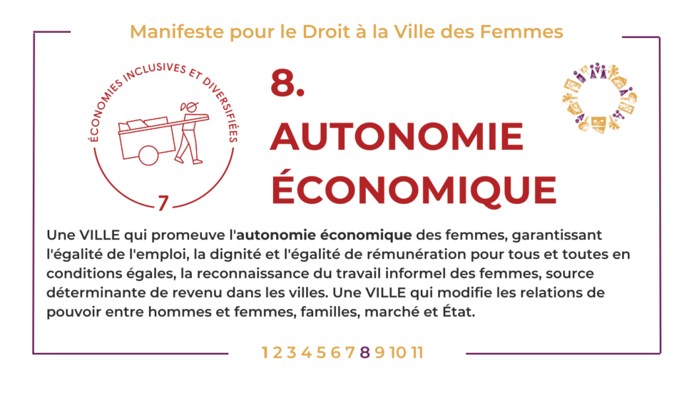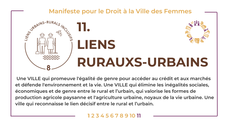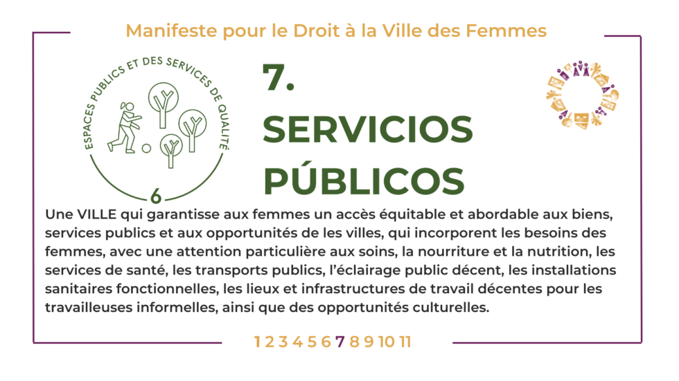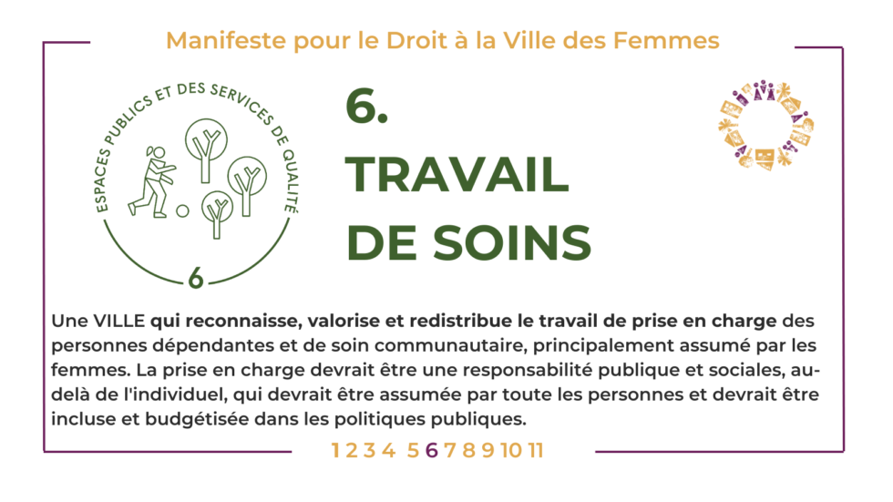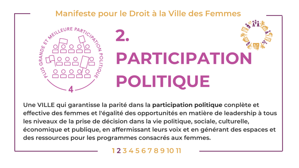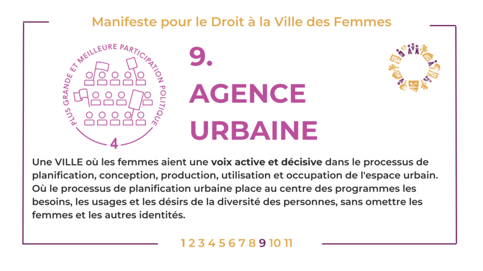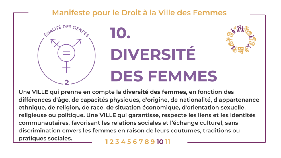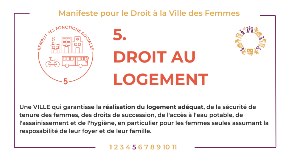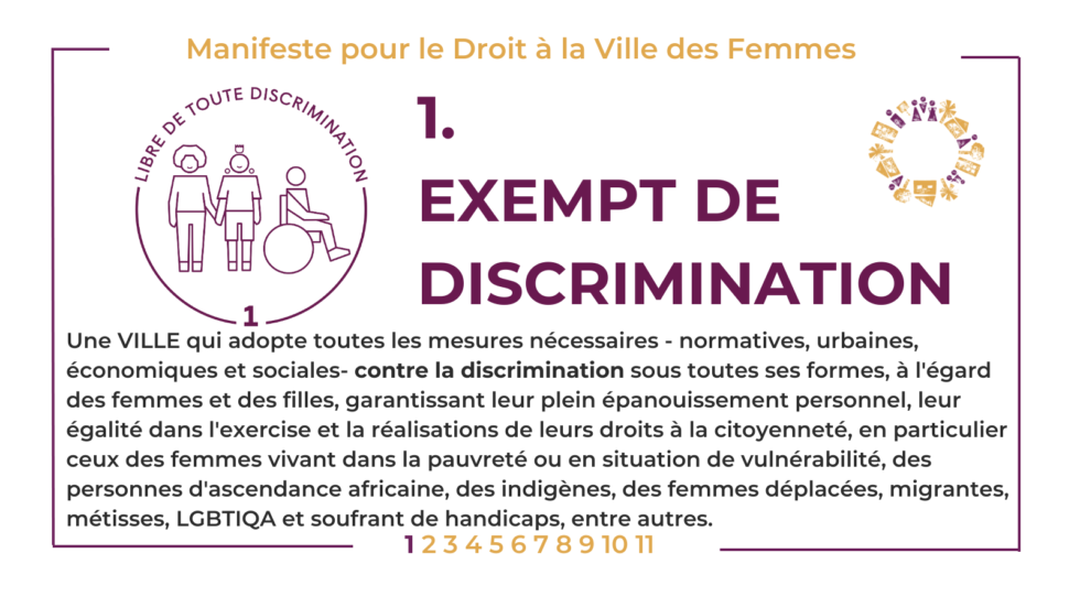 Nous jouirons d’un monde meilleur si les femmes peuvent réaliser tout leur potentiel, si elles ont la possibilité de participer à tous les niveaux de décision dans les dimensions politiques, sociales, culturelles, économiques et publiques de la vie, si elles se sentent en sécurité et libres, si elles ont un accès abordable à un logement adéquat et aux services publics, si le travail de soin est redistribué et inclus dans les politiques publiques, si elles ont un emploi, une dignité et un revenu égaux, si elles ont leur mot à dire dans le processus de planification, de production et d’utilisation des espaces urbains, si leur diversité est reconnue et respectée et si elles sont traitées avec égalité de genre.