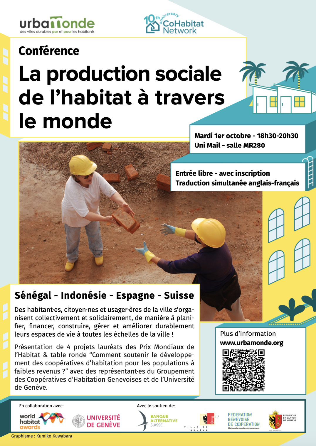Intervenant·es : Représentant·es de projets primés par les Prix Mondiaux de l’Habitat au Sénégal (urbaSEN), en Indonésie (Urban Poor Consortium), en Espagne (Sostre Cívic) et en Suisse (La Ciguë) (voir ci-dessous pour plus de détails).