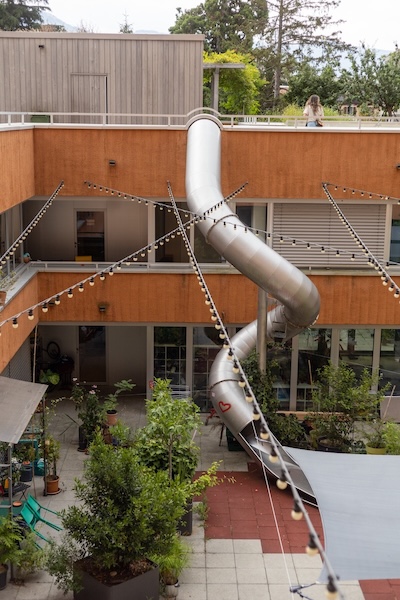 A Genève, nous avons rencontré le Groupement des coopératives d’habitation genevoises (GCHG) et le réseau de l’économie solidaire APRÈS-GE, et nous nous sommes rencontrés CODHA que, comme Sostre Cívic, est une coopérative d’habitation qui gère plusieurs projets au sein d’une même organisation selon le modèle de transfert d’usage. La CODHA compte plus de 7.000 membres, 800 logements répartis dans 19 immeubles et 12 projets en développement. L’un d’eux, Jonction Écoquartier – Écojonx, est un ensemble de 100 logements qui se distingue par son efficacité énergétique, sa mobilité durable (seules les personnes sans voiture peuvent y vivre) et l’autogestion des espaces communs et extérieurs (jusqu’à 1000m²). Parmi ceux-ci, on trouve un jardin urbain, plusieurs salles polyvalentes et de jeux, un espace bricolage, des débarras, des chambres d’amis et même un toboggan qui descend sur trois étages, du jardin au patio intérieur !