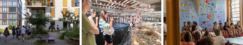 Un autre point fort a été le nouveau quartier écologique de Les Vergers de Meyrin, avec plus de 1.300 logements répartis dans 30 bâtiments, la plupart gérés par jusqu’à sept coopératives différentes. Une référence en matière de collaboration entre coopératives et administration pour la promotion de quartiers entiers offrant des logements abordables, des infrastructures partagées et une grande qualité architecturale et environnementale. Nous avons visité Voisinage (géré par CODHA, deux immeubles de 120 logements) et Équilibre (trois bâtiments de 70 logements), qui se distinguent par la multitude d’espaces partagés (salle de sport, mur d’escalade, buanderies et autres salles polyvalentes, ainsi que par les nombreuses activités communautaires ouvertes au quartier telles que théâtres, fermes, cirque, etc.), la qualité de l’environnement et les processus participatifs. Nous avons également visité La Ciguë, une coopérative étudiante liée à la CODHA, avec des groupes de 2 à 15 personnes et une structure de participation horizontale, qui facilite l’accès des jeunes et forme les futurs membres de la coopérative.